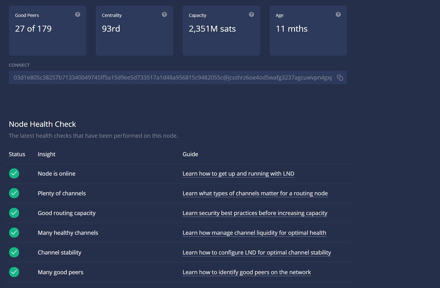 The six check marks are your goal. If you do not have all six checked, your goal should be to work on your node until all six are good. This is a great way at a glance for you and others to see if you are running a good node. You will notice that the total amount of bitcoin is not a metric. The Lightning Network is all about success and throughput, not how much bitcoin you are putting on your node. There are benefits to having large amounts of bitcoin, but it is not required to run a good node. Let’s go through these