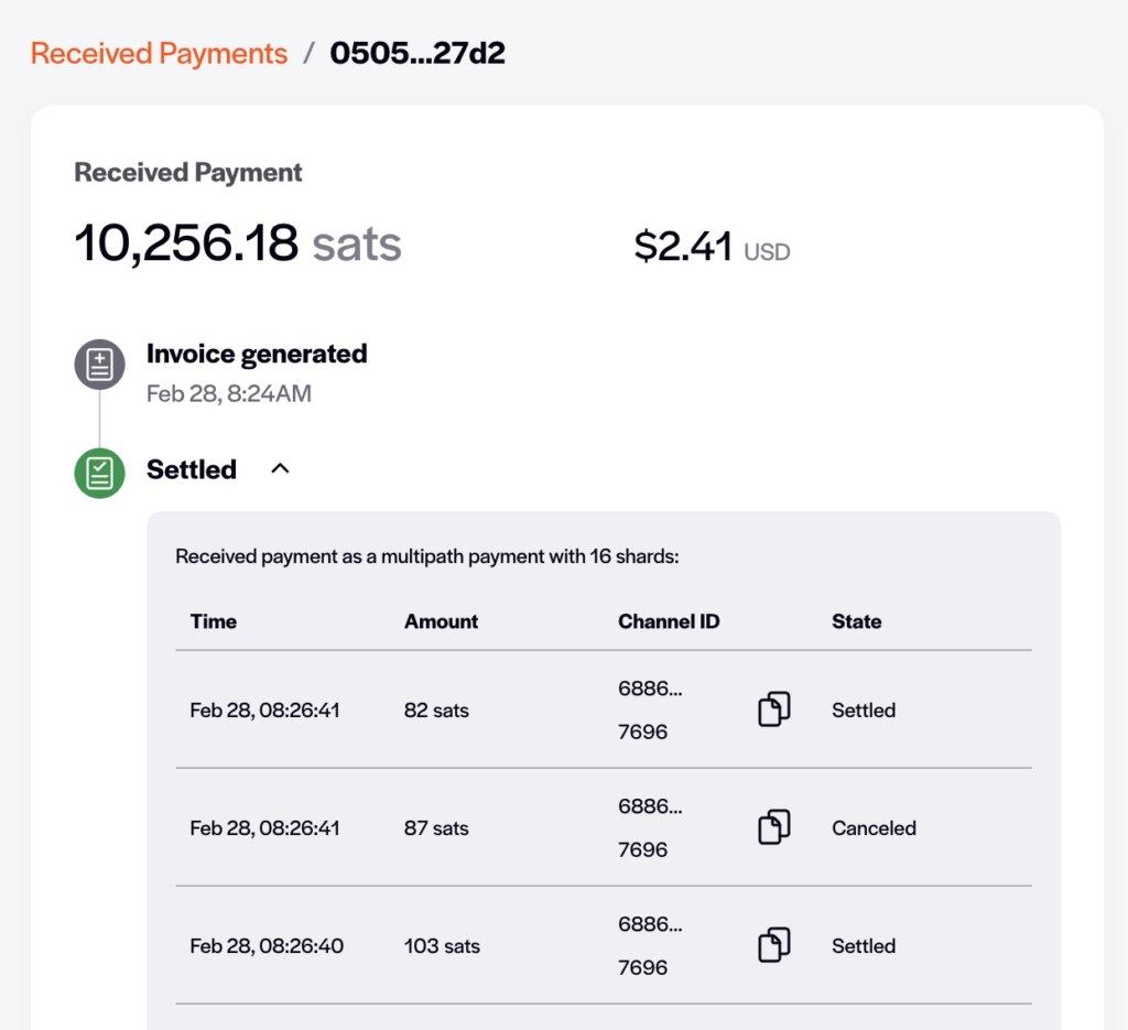 No problem. Expand when the arrow is present, and you’ll get detailed info on that state. In the case above, this payment is now considered settled - but it took a few multi-path payments (sixteen!) to get there. You don’t have to understand the inner workings of the HTLCs to tell a customer the reason why their payment failed is that their HTLC failed.