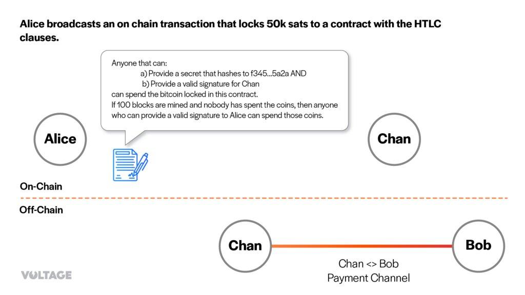 Remember: Alice uses an intermediary, Chan, with a Lightning node and can pay Bob. She’ll pay Chan with on-chain funds and Chan, in turn, will pay Bob. We need to make sure that Chan can only redeem the money Alice sent him if he has paid Bob.