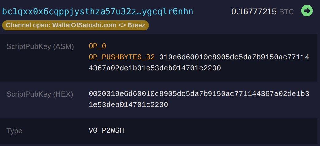 This one is a funding transaction between Wallet Of Satoshi and Breez. There are four inputs and two outputs. The first one is the change, going back to Wallet of Satoshi, and the second one is the P2WSH output that encodes the 2-of-2 multi-signature. Inspecting the details, we can see that the funding output is actually a P2WSH, as expected.