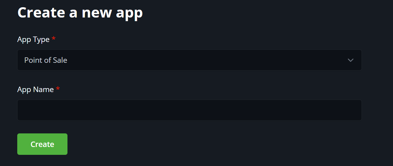 The next part is easy. On the left side click”+ New App” Select Point of Sale and name your App. Then click Create.