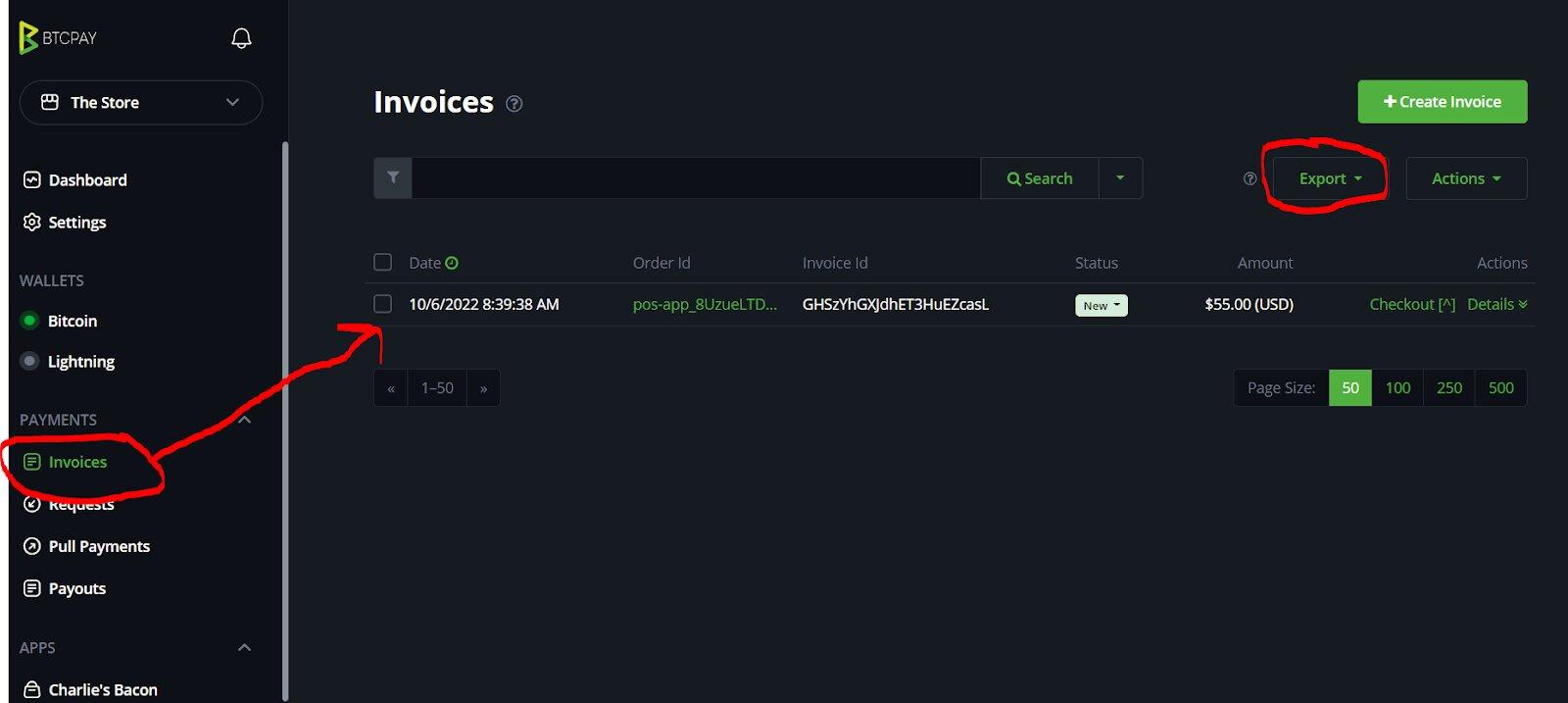 This invoice screen should be presented to the customer to pay. After payment, the QR code will become a green checkmark, and your funds will be displayed in the external wallet that you generated the public key from steps 10 and 11. To see a complete list of transactions, you can click “Invoices” on the BTCPayServer page. You can export the invoice list into a CSV file for bookkeeping.