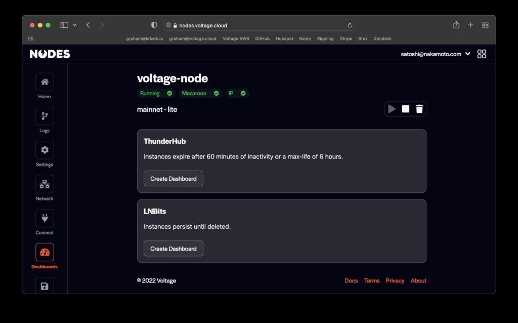 Using LNbits on Voltage is so easy. Simply navigate to the Dashboards tab on your node's page, find LNbits right below ThunderHub, and click Create Dashboard. This will start creating your LNbits instance for this node. Once it's ready. You'll have a link to log in to your LNbits instance. These instances are persistent (unlike ThunderHub) and can be used to develop apps on top of your Lightning node!