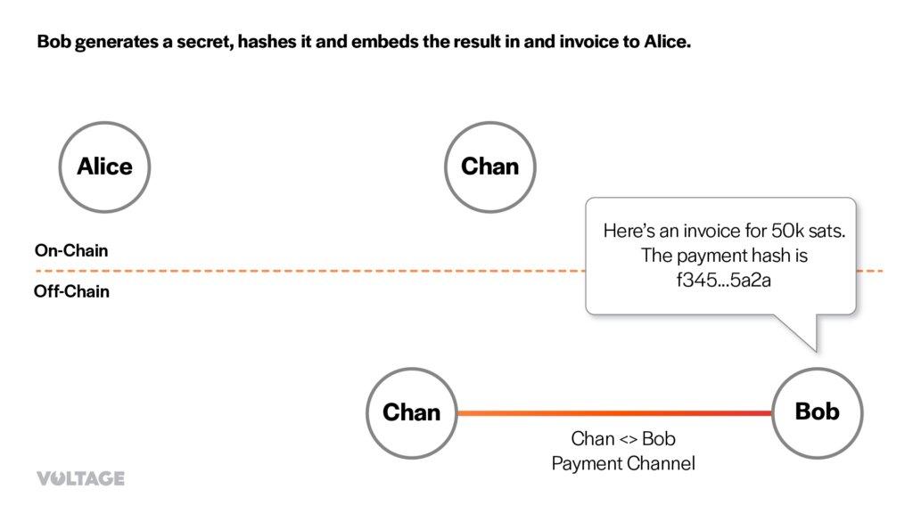 - Bob generates a secret, hashes it and embeds the result in an invoice to Alice.