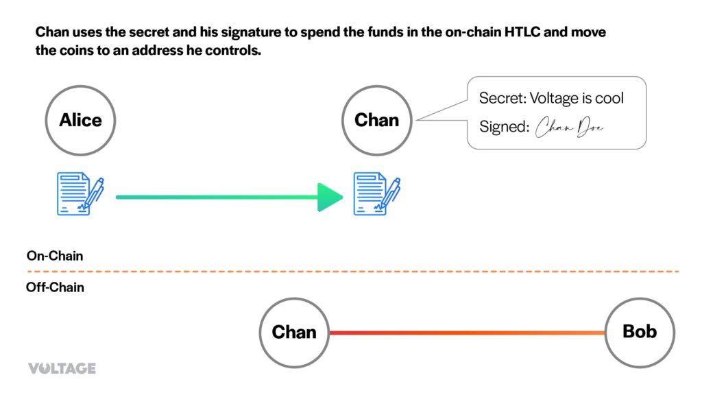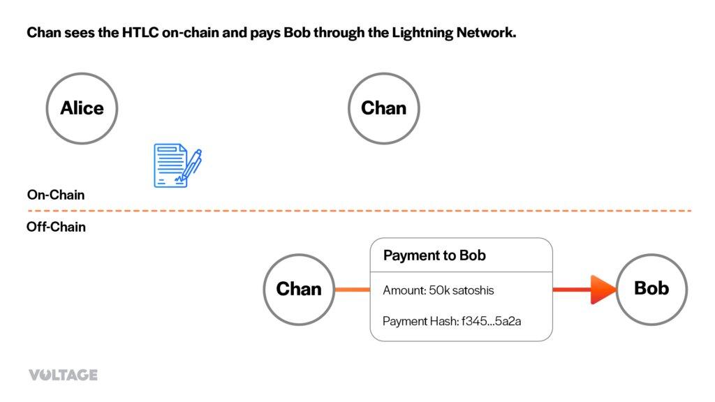 3. Chan sees the HTLC on-chain and pays Bob through the Lightning Network.
