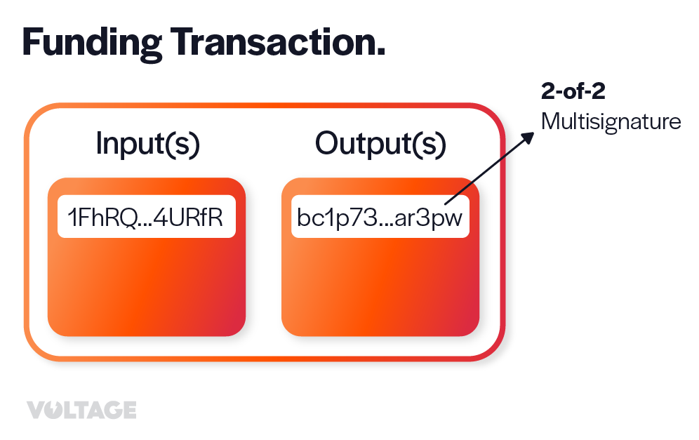The transaction takes funds from the peer that requested to open the channel as the input and locks in a “joint ownership” output. This “joint ownership” is a 2-of-2 multi-signature output that requires signatures from both channel partners in order to spend the output.