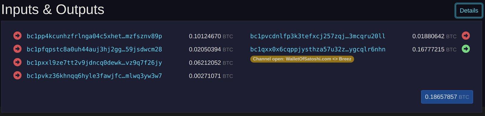 This one is a funding transaction between Wallet Of Satoshi and Breez. There are four inputs and two outputs. The first one is the change, going back to Wallet of Satoshi, and the second one is the P2WSH output that encodes the 2-of-2 multi-signature. Inspecting the details, we can see that the funding output is actually a P2WSH, as expected.